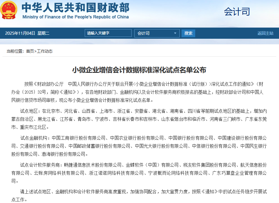 按照《财政部办公厅 中国东说念主民银行办公厅对于连合开展<小微企业增信管帐数据圭表(试行版)>长远试点使命的奉告》(财办会〔2025〕32号,简称《奉告》),在各地财政部门、金融机构以及管帐软件劳动商积极报名的基础上,经财政部管帐司和中国东说念主民银行信贷市集司审核,现公布小微企业增信管帐数据圭表长远试点名单。